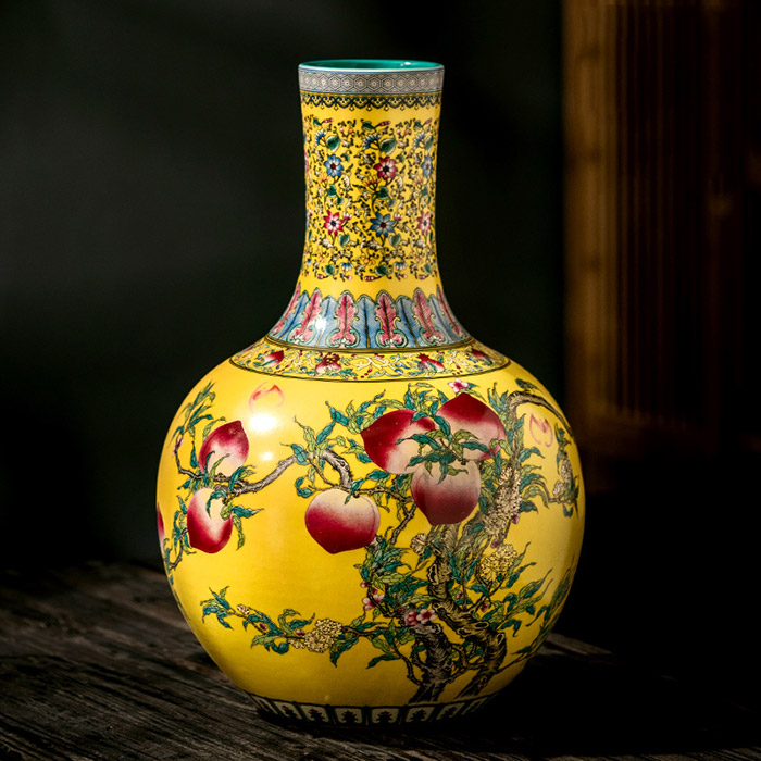 Antique big yellow enamel ceramic vase ornaments with nine peaches on