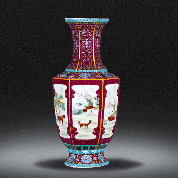 Qing dynasty qian long red pastel chinese zodiac 6 square ceramic vase