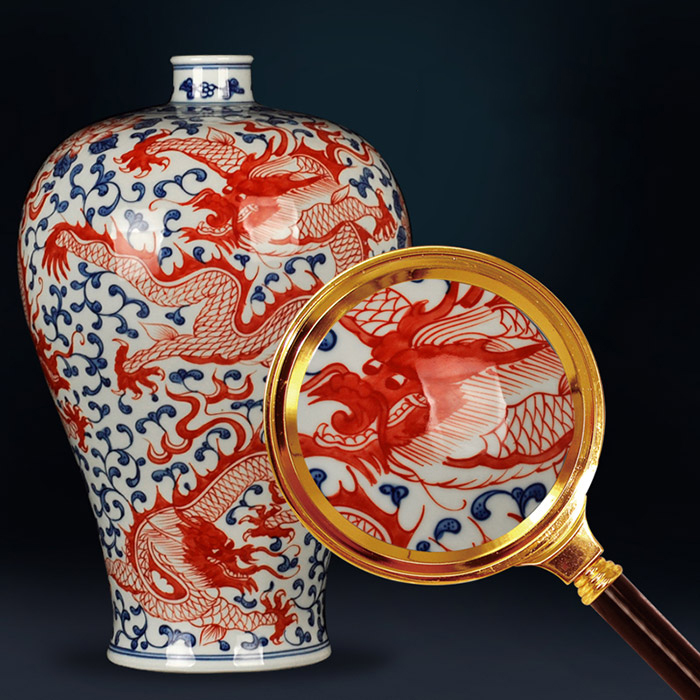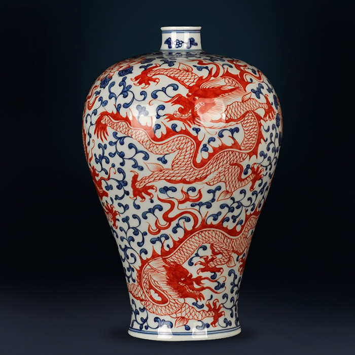 Hand painted vintage blue and white glaze red dragon ceramic vase