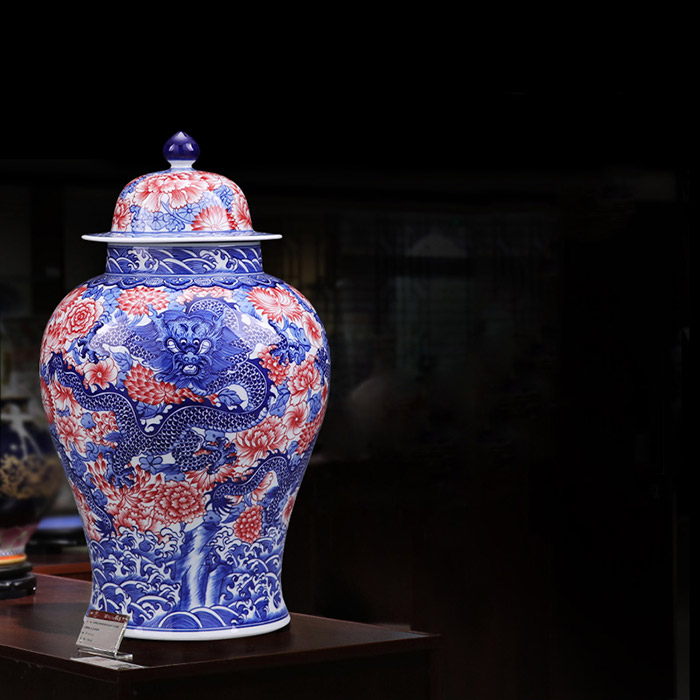 Designer hand-painted blue and white porcelain dragon red in glaze jar