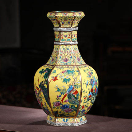 Vintage middle yellow majolica ceramic vase ornaments outline in gold