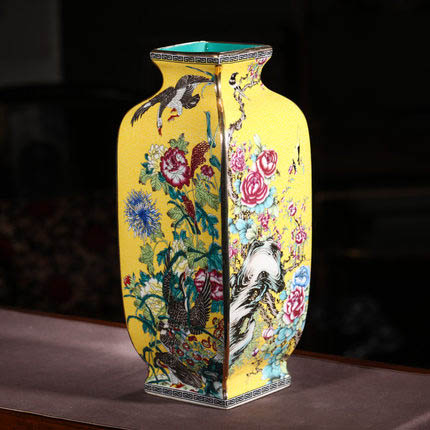 Vintage middle yellow majolica ceramic vases ornaments outline in gold