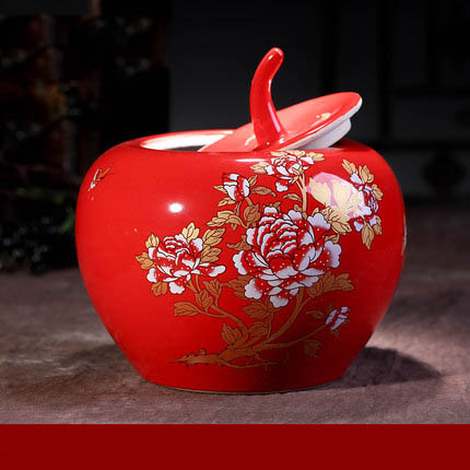 peony flower pattern apple shape big red ceramic storage jar