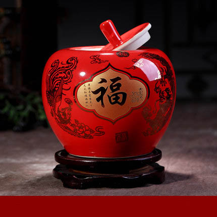 Dragon and Phoenix pattern apple shape red lucky ceramic storage jar