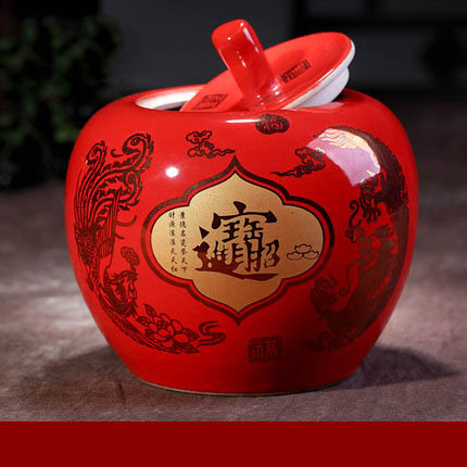 Apple Shaped Good Fortune Red Ceramic Storage Jar