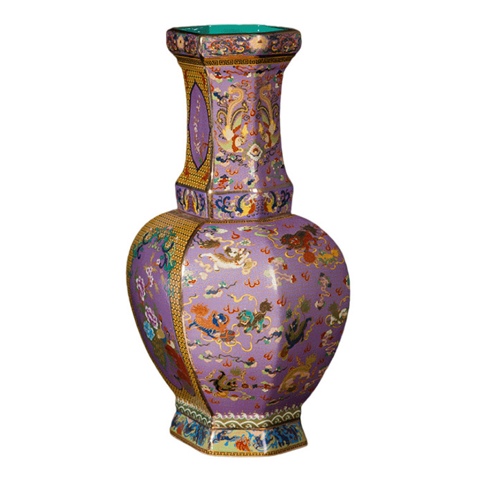 Large hexagonal enamel pastel ceramic vase with birds and flowers