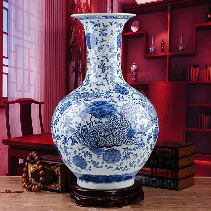 Blue and white underglaze colorful dragon ceramic flower vase ornament