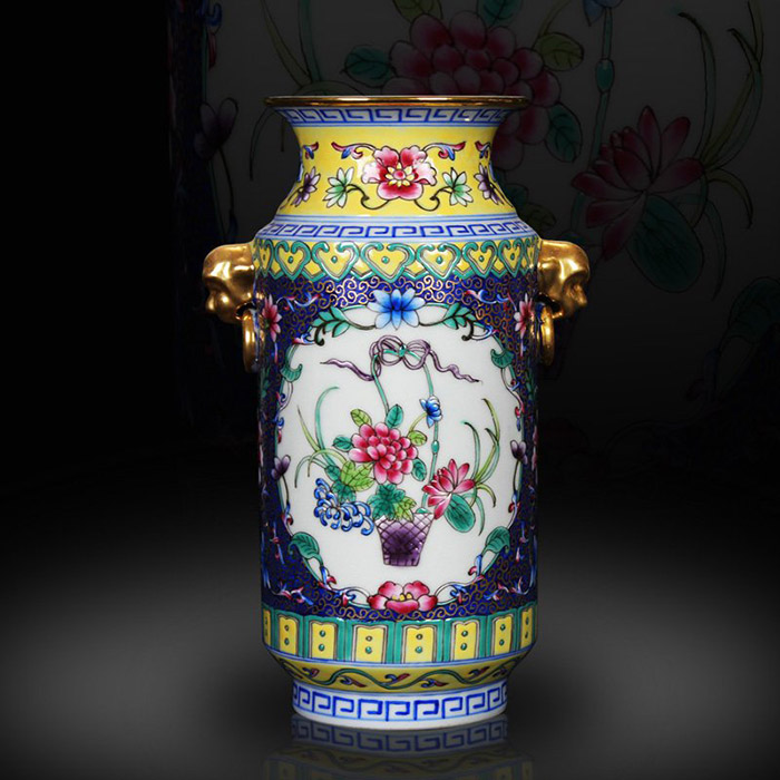 Enamel double lion head gilt blue open altar ceramic flower vase home