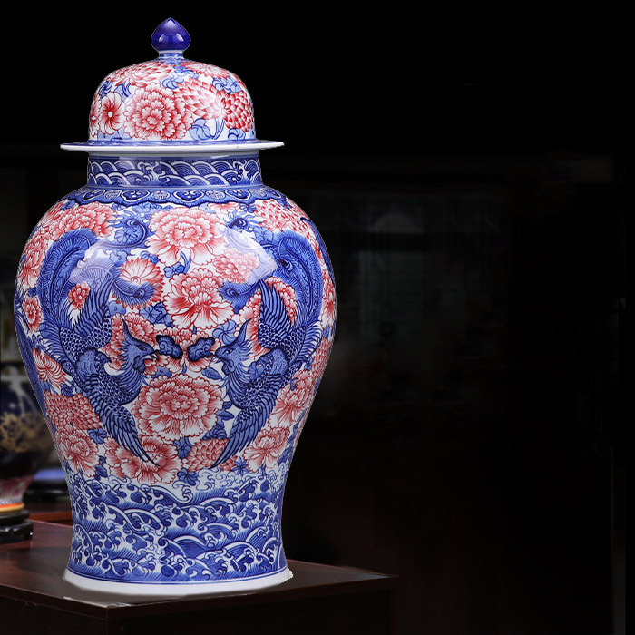 Hand painted blue and white porcelain phoenix red in glaze jar