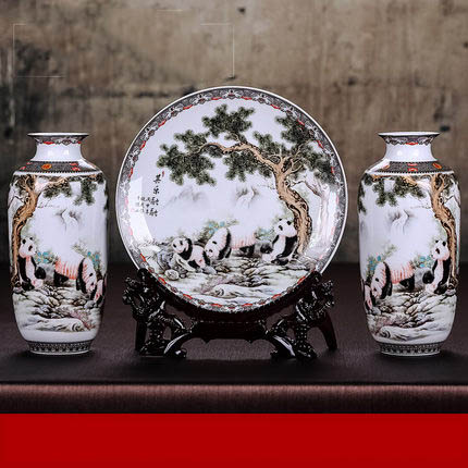 three-piece pandas and tree decoration ceramic hanging plate and vase